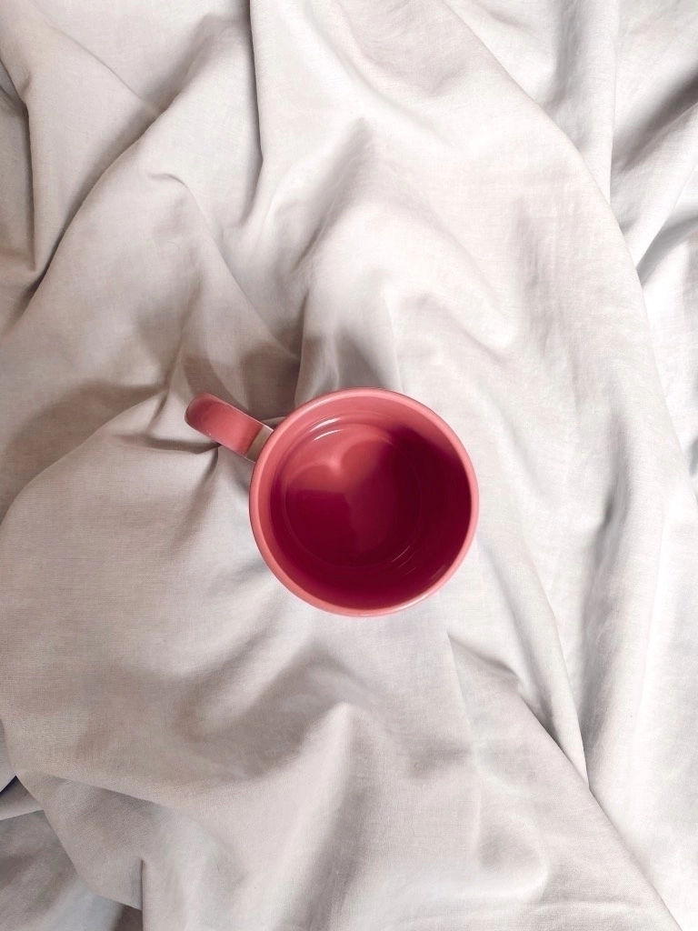caneca branca com a alça e o interior na cor rosa. capacidade de 325ml.