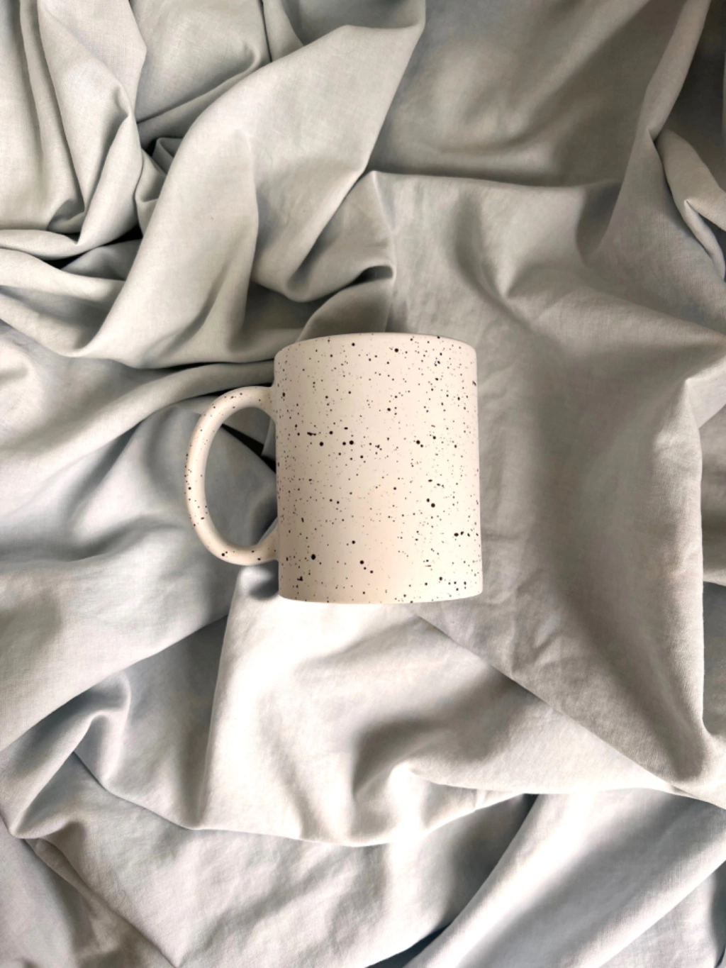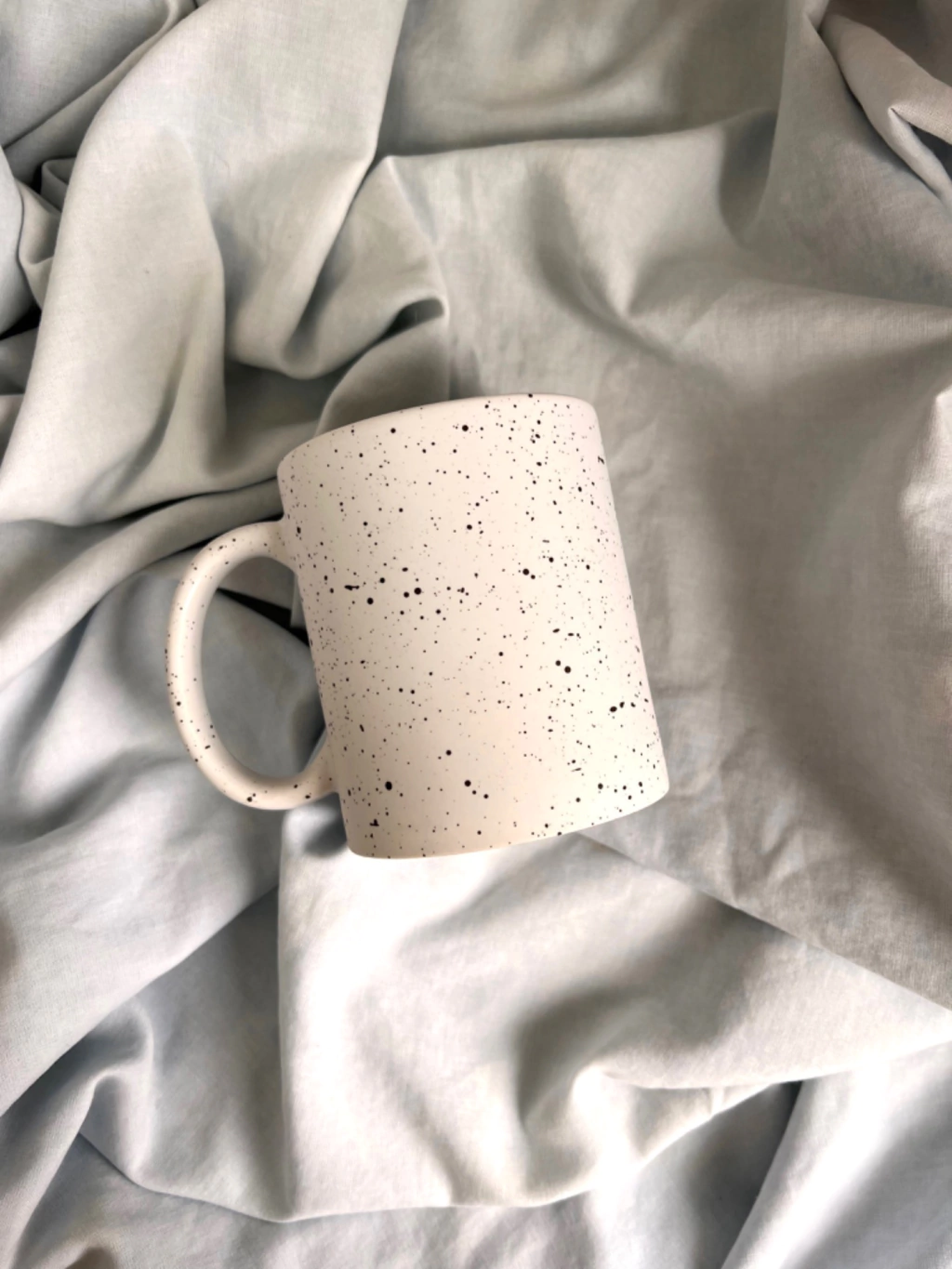 caneca de cerâmica branca com pontinhos irregulares preto. capacidade de 325ml.