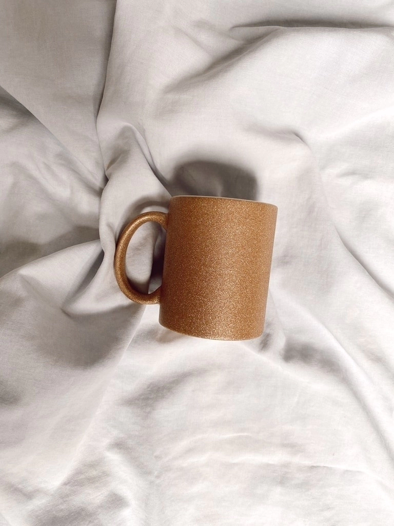 caneca na cor caramelo com textura de glitter. capacidade de 325ml.